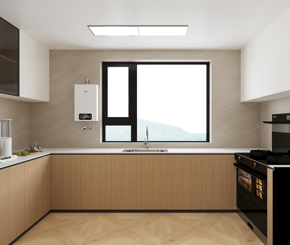 廚房采用 L 型櫥柜設(shè)計,充分利用空間,操作動線流暢。木色與白色櫥柜搭配,簡潔清新。大窗戶引入 充足自然光,讓烹飪空間更明亮。電器嵌入櫥柜,使整體外觀整潔統(tǒng)一,打造出功能齊全的烹飪空間。