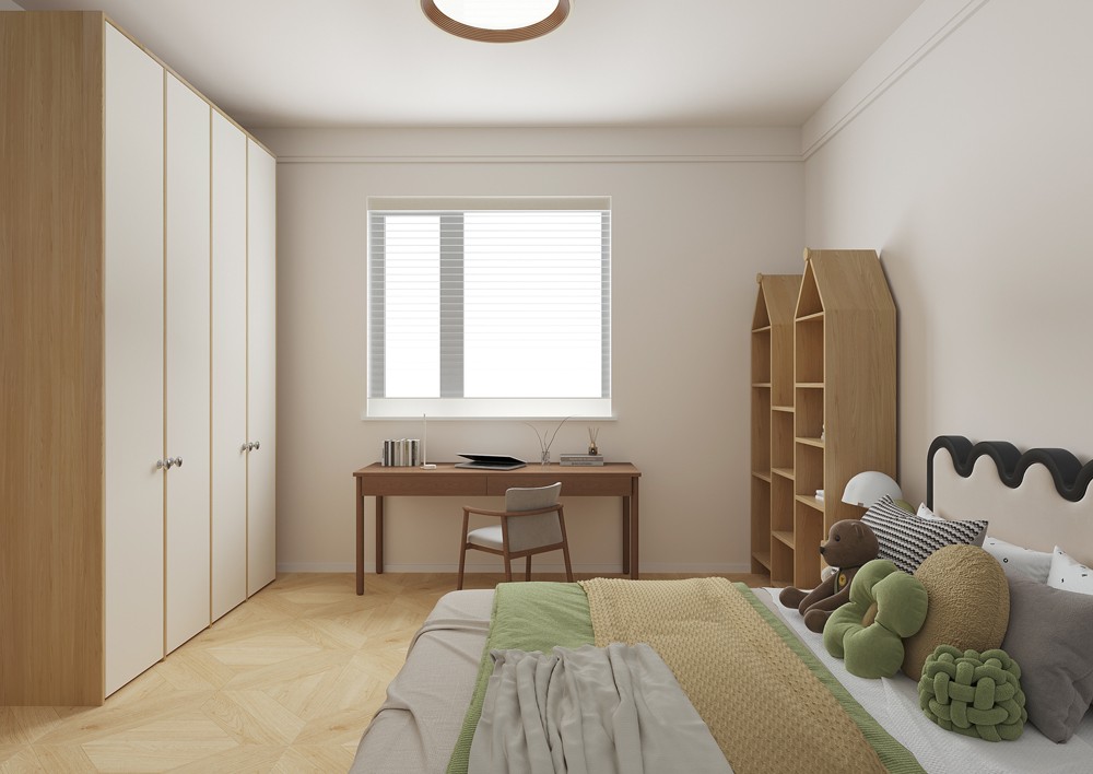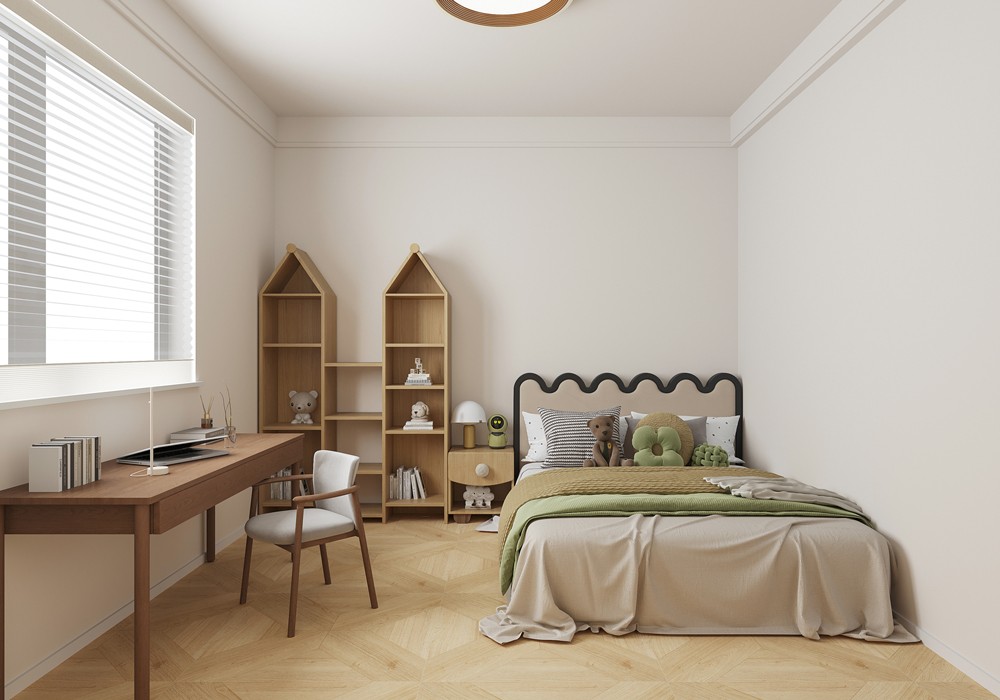 兒童房設(shè)計充滿童趣與溫馨。造型獨特的書架與柔和色調(diào)床品相搭配,營造活潑氛圍。設(shè)置書桌區(qū)域, 滿足孩子學(xué)習(xí)需求。整體空間布局合理,既保證充足活動空間,又提供舒適睡眠與學(xué)習(xí)環(huán)境。