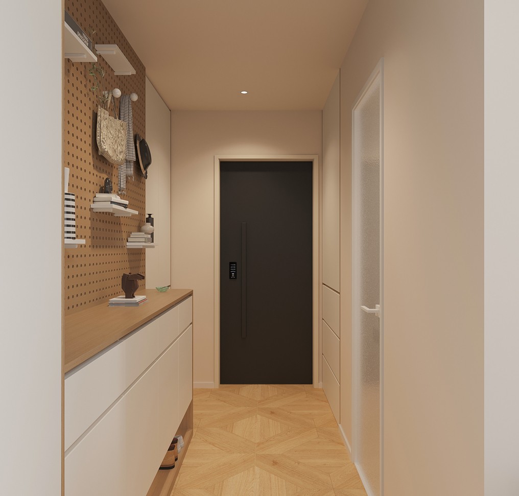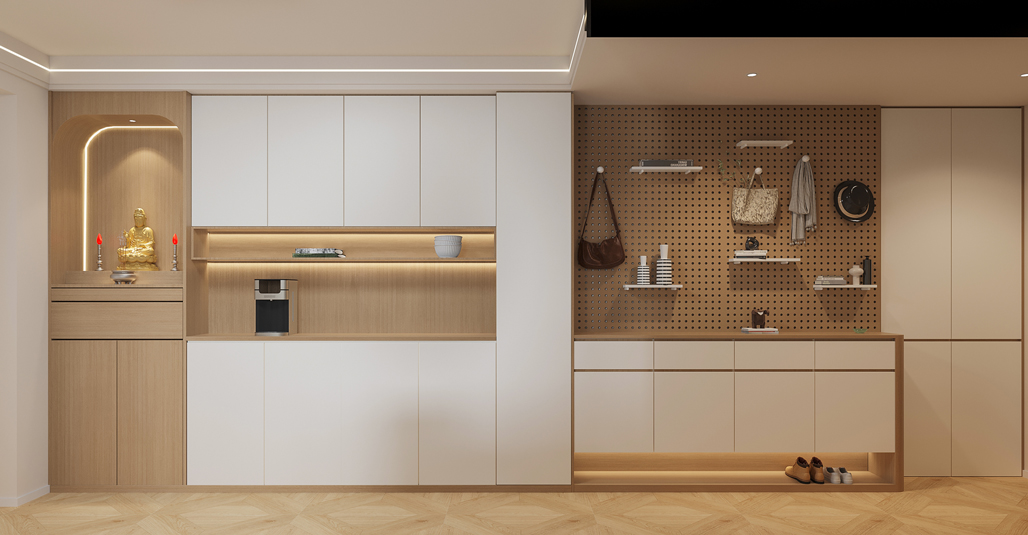入戶區(qū)域以實用與美觀兼具為設(shè)計核心。左側(cè)打造一體化定制柜,中部鏤空嵌入燈帶,可放置隨手物品, 底部留空方便放置常穿鞋子;佛龕專屬區(qū)域設(shè)計,滿足精神信仰需求。右側(cè)洞洞板與掛桿、隔板結(jié)合, 可靈活掛放包包、帽子等,下方柜子增加收納,整體營造溫馨有序的歸家氛圍。