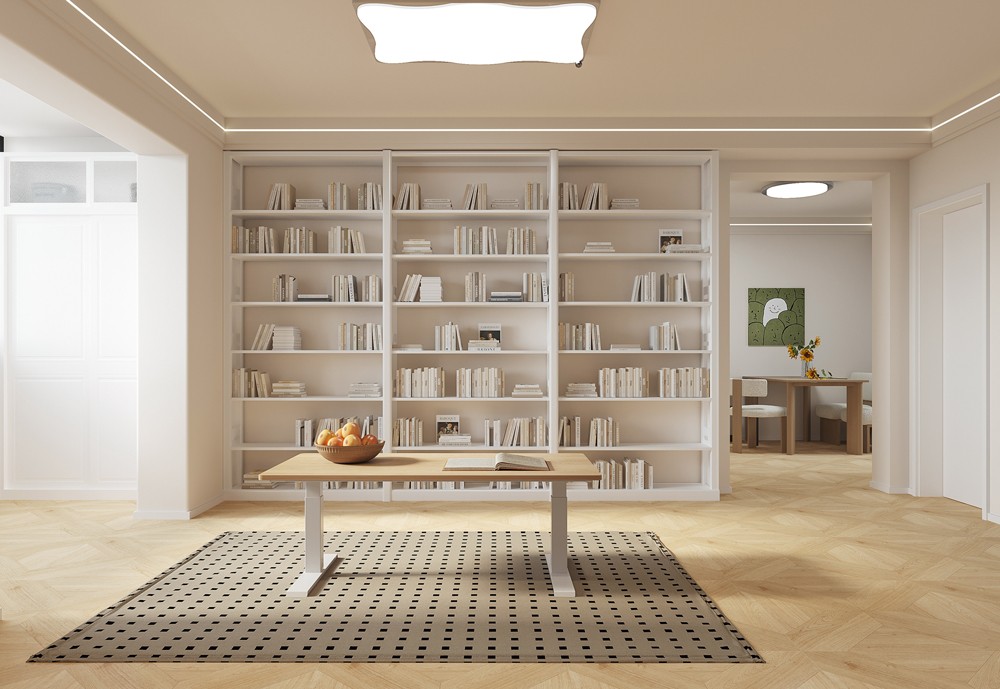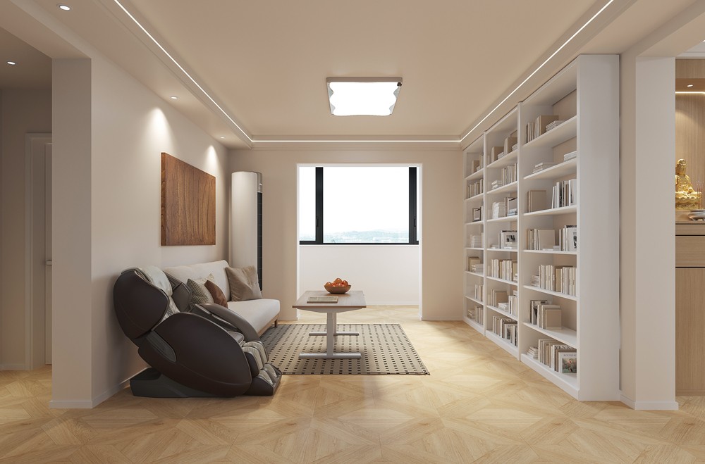 客廳設(shè)計追求簡約與舒適。淺色系墻面搭配簡約吸頂燈,營造明亮開闊空間感。一側(cè)整面墻打造書架, 滿足收納與展示需求,為空間增添書香氣息。沙發(fā)、茶幾擺放規(guī)整,留出寬敞活動區(qū)域,整體風(fēng)格簡潔大方, 是放松與休閑的理想場所。