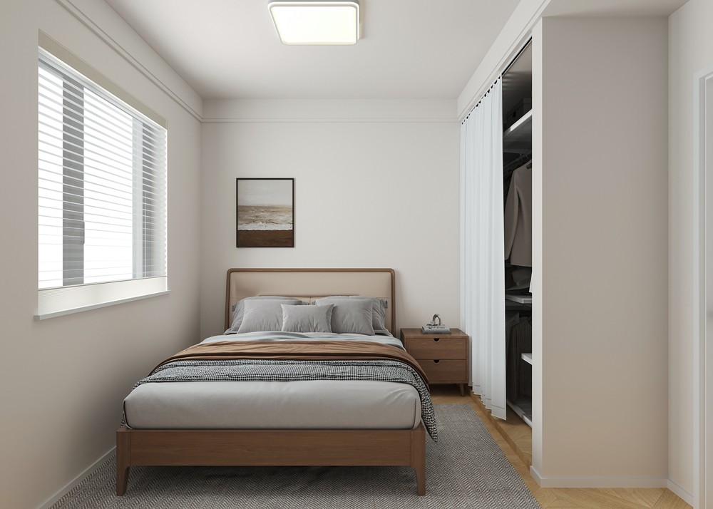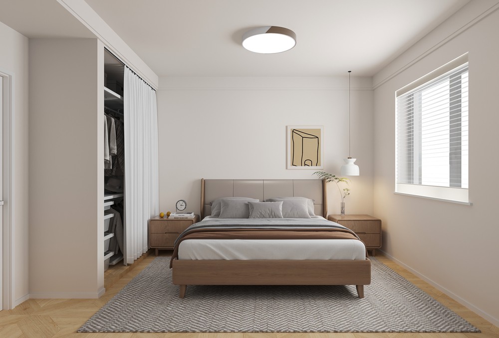 主臥以營造寧靜舒適睡眠環(huán)境為目標(biāo)。木質(zhì)床具搭配柔軟床墊和簡約床品,帶來溫馨舒適體驗。床頭掛畫 與吊燈增添藝術(shù)氛圍與柔和光線。一側(cè)定制衣柜,滿足衣物收納需求,整體色調(diào)柔和,營造放松的休憩空間。