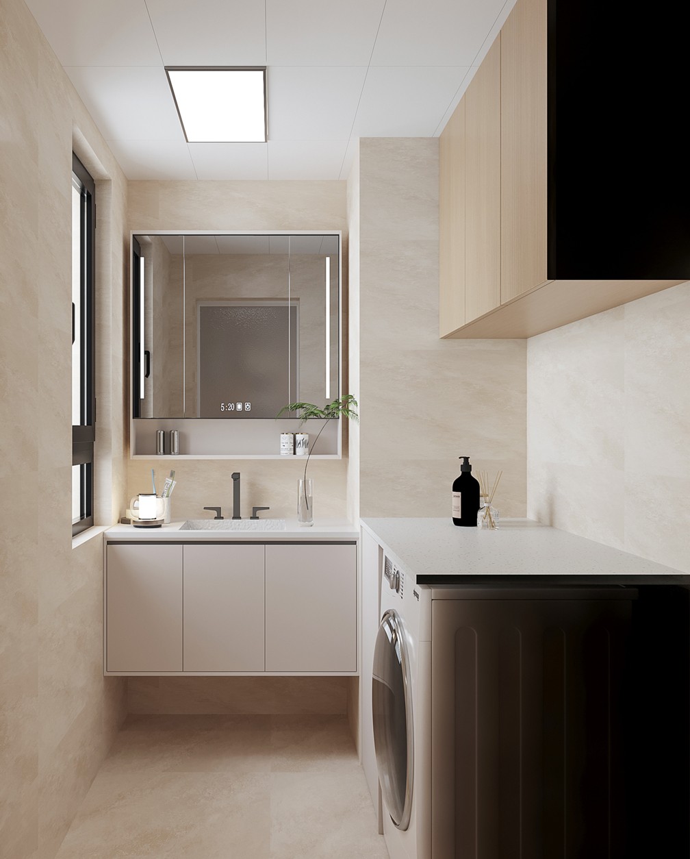 衛(wèi)生間干濕分離設(shè)計,提高使用效率與安全性。洗漱區(qū)鏡柜與洗手臺組合,滿足收納需求。洗衣機(jī)嵌入柜體, 節(jié)省空間。整體采用淺色系瓷磚,搭配簡潔燈具,營造干凈清爽的衛(wèi)浴空間。