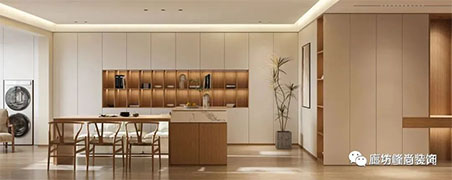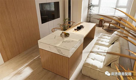 客餐廳簡(jiǎn)潔的造型配以原木色的家具顏色,溫馨自然,去客廳化的設(shè)計(jì)手法讓空間更加靈活,島餐臺(tái)和長(zhǎng)餐桌的組合讓空間更加實(shí)用。
