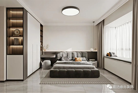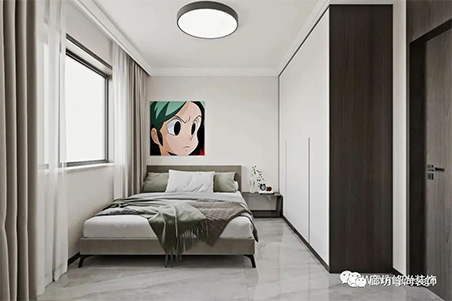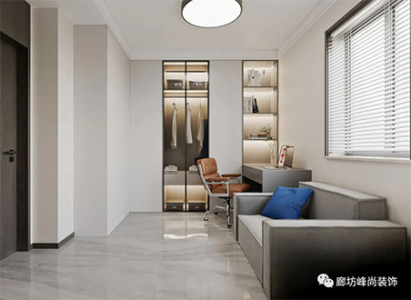 格柵隱形門如魔法大招的開關,以進退有度的含蓄,把控著主臥空間與外界的關系尺度,私密與開放,皆在一念之間。