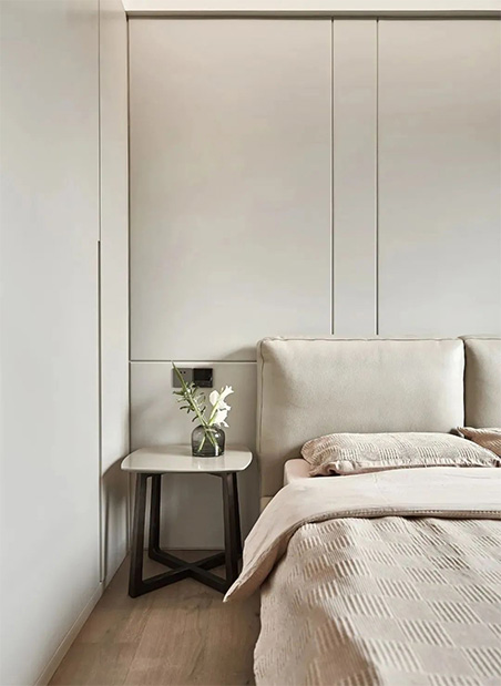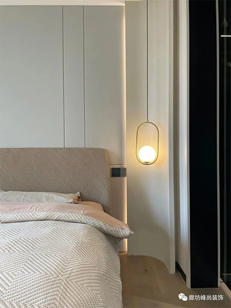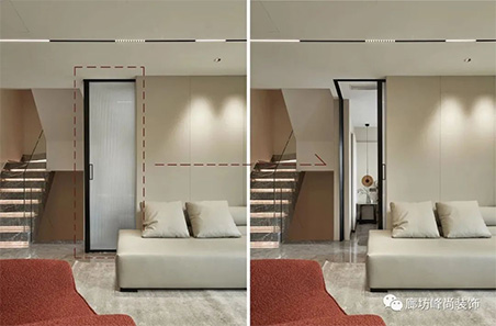 一層臥室采用雙項(xiàng)內(nèi)嵌推拉門(mén)、作為臨時(shí)居住場(chǎng)所使用。同時(shí)具有背景裝飾作用、開(kāi)啟時(shí)能更好的展現(xiàn)空間的尺度。