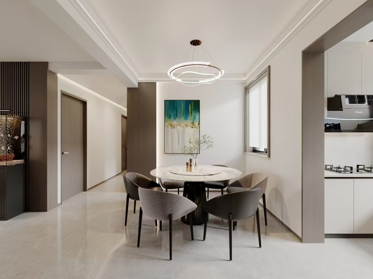 緊鄰廚房,動線流暢。圓形的大理石餐桌搭配造型別致的餐椅,方便家人用餐交流。墻上的裝飾畫為餐廳 增添了藝術氣息。 環(huán)形吊燈不僅是照明工具,更是空間的視覺焦點,營造出溫馨浪漫的用餐氛圍?繅Φ牟瓦吂裉峁┝顺渥 的收納空間,滿足日常餐具和雜物的存放需求。