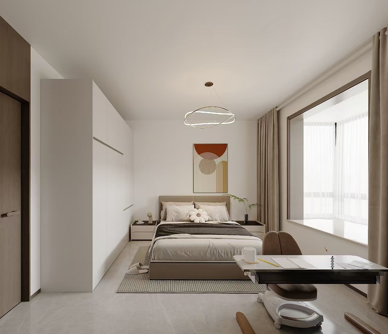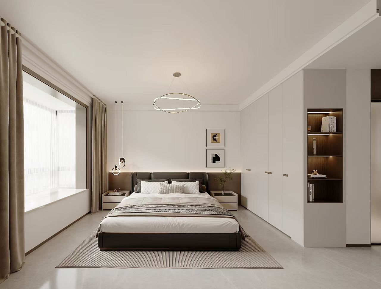以簡約舒適為設計核心。通頂式衣柜,白色的柜門搭配木質元素,既美觀又實用,提供了大量的衣物收納 空間。床頭的吊燈與壁燈設計精巧,營造出溫馨的睡眠氛圍。背景墻簡潔干凈,搭配幾幅裝飾畫,增添了 藝術感。窗邊的自然光線充足,搭配柔軟的窗簾,營造出寧靜、放松的休息環(huán)境。