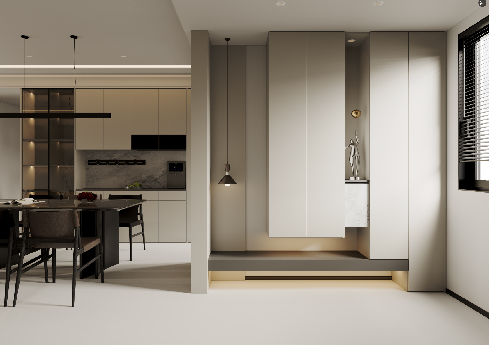 入戶區(qū)域以簡約實(shí)用為導(dǎo)向。靠墻定制到頂收納柜,滿足鞋子、外套及雜物存放需求。底部懸空設(shè)計(jì), 方便放置常穿鞋子,柜內(nèi)合理規(guī)劃層板與抽屜,提升收納效率。柜身色調(diào)與整體家居風(fēng)格相呼應(yīng),營造 和諧統(tǒng)一的入戶氛圍。