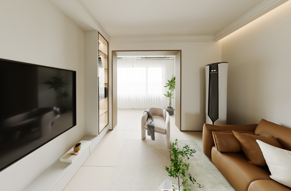 以簡約筆觸勾勒空間輪廓,淺米色墻面鋪陳寧靜基調(diào),棕色皮質(zhì)沙發(fā)成為溫暖注腳。 懸浮式電視柜增添輕盈感,燈帶如靈動線條,勾勒出光影層次。開放式展示架與整體風(fēng)格相融, 擺放著屋主的收藏,在簡約中彰顯獨特品味。
