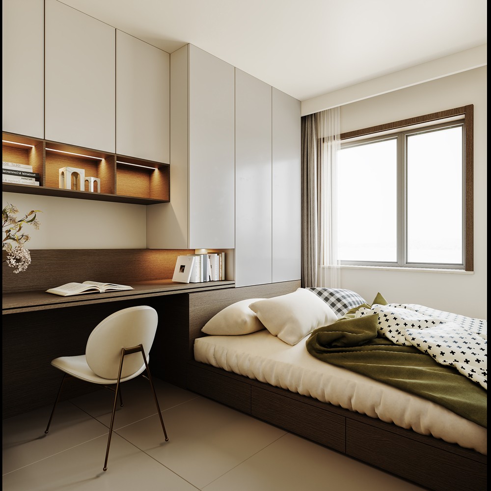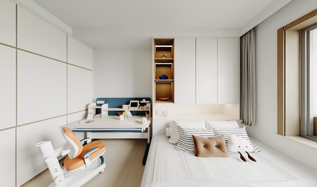 空間布局緊湊而不失溫馨,一體化定制的書桌與床榻,充分利用每一寸空間。柔和的色彩搭配營造出 舒適的成長環(huán)境,充足的收納空間可存放孩子的書籍、玩具。窗邊光線充足,為孩子打造了一個專屬 的學(xué)習(xí)與閱讀角落。
