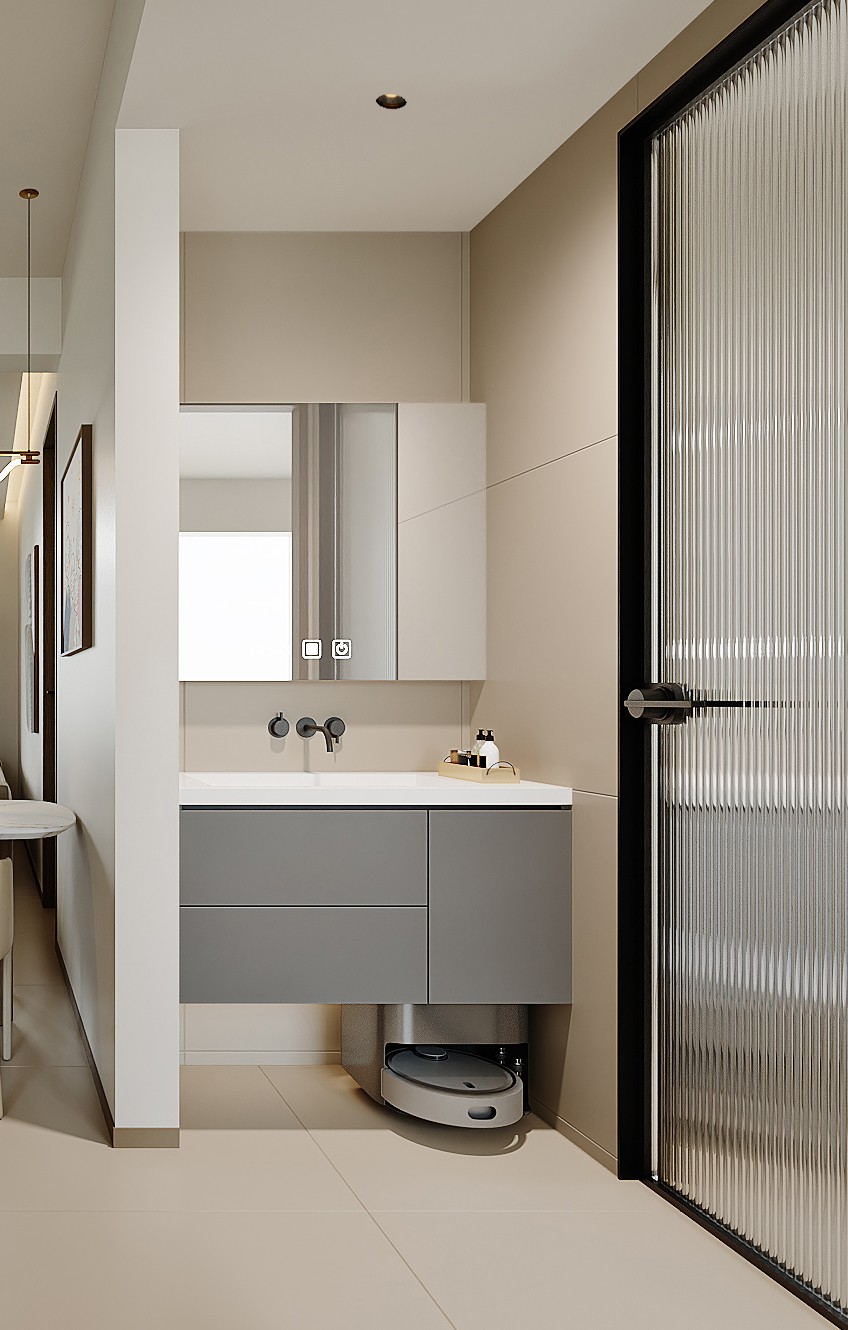 以實用為導(dǎo)向進(jìn)行設(shè)計,干濕分離確?臻g整潔干爽。懸浮式洗手臺設(shè)計時尚且便于清潔,鏡柜隱藏 收納日常用品,讓臺面保持清爽。淋浴區(qū)與坐便器、洗衣機(jī)在有限空間內(nèi)實現(xiàn)功能最大化,滿足日常 生活需求。