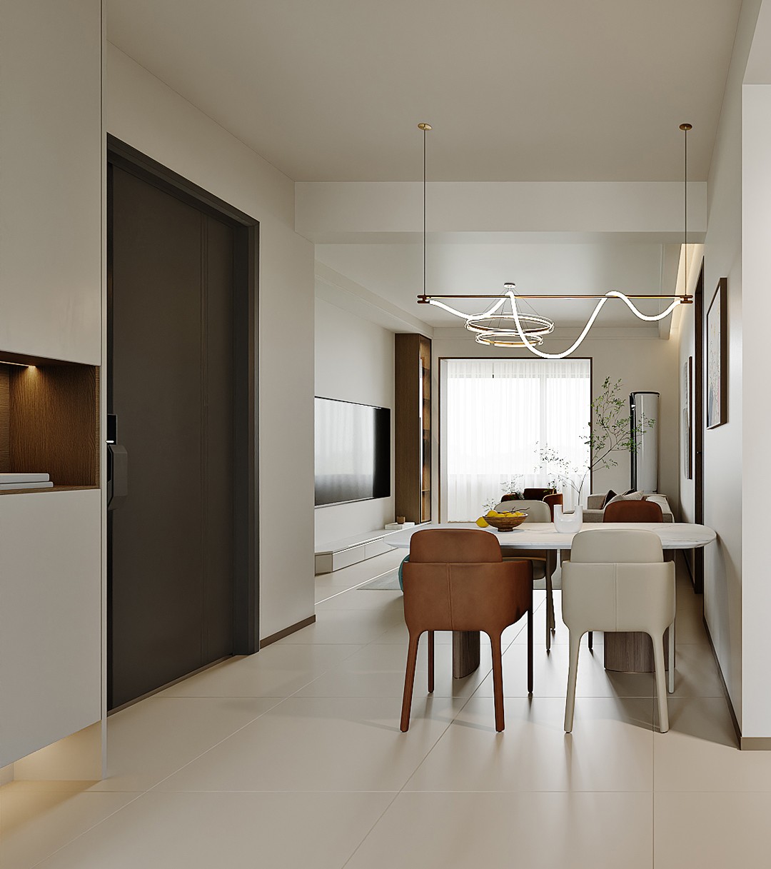 開放式布局模糊了餐廳與客廳邊界,餐桌椅的色彩與材質(zhì)呼應(yīng)整體風(fēng)格,營造和諧氛圍。線條簡潔 的吊燈如藝術(shù)裝置,為用餐空間增添時尚感。餐邊柜兼具收納與展示功能,玻璃柜門透出精致器物, 讓每一次用餐都充滿儀式感。