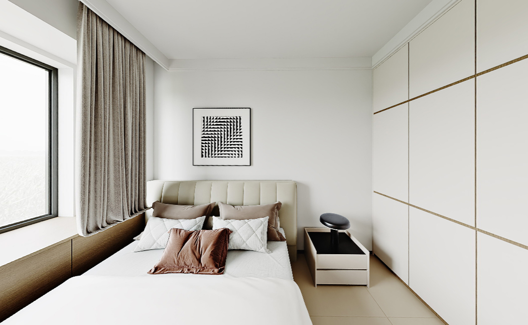 簡約的設(shè)計手法營造出寧靜睡眠氛圍,無主燈設(shè)計以燈帶和筒燈營造溫馨光線。頂天立地的衣柜提供 強大收納功能,隱藏式把手保持外觀整潔。床邊裝飾畫為空間增添藝術(shù)氣息,讓屋主在忙碌一天后, 能于此處盡享靜謐與放松。