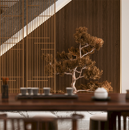 深諳竹與茶在文化上的某種交相輝映,引入清雅靈動的竹木、層次美感的格柵。