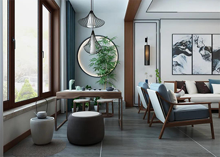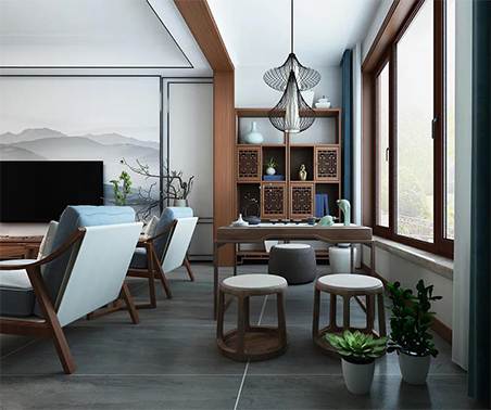 南陽臺:打造了一個中式的喝茶區(qū)域,同時在西側(cè)設計一個室內(nèi)景觀,竹子是中式最好的綠植搭配。